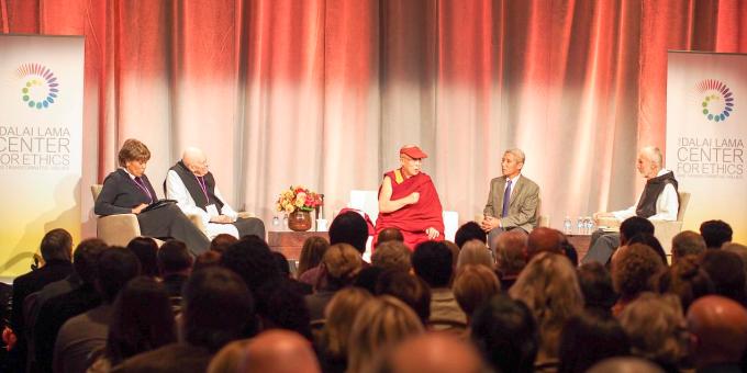 Thomas Keating (segundo de izquierda a derecha) junto al Dalai Lama y el hermano David, Boston, 2012.